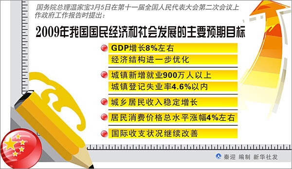 政府工作報(bào)告提出2009年中國(guó)經(jīng)濟(jì)增長(zhǎng)預(yù)期目標(biāo)為8%左右。這也是中國(guó)政府連續(xù)五年將經(jīng)濟(jì)增速目標(biāo)設(shè)定為這一數(shù)字。但今年這一目標(biāo),卻格外不尋常。 在國(guó)際金融危機(jī)尚未見(jiàn)底,世界各大權(quán)威機(jī)構(gòu)對(duì)全球經(jīng)濟(jì)增長(zhǎng)預(yù)測(cè)悲觀,主要經(jīng)濟(jì)體將會(huì)出現(xiàn)負(fù)增長(zhǎng)的背景下,人們十分關(guān)心中國(guó)經(jīng)濟(jì)能否順利達(dá)到這一目標(biāo)。 “經(jīng)濟(jì)增長(zhǎng)的周期性調(diào)整與國(guó)際金融危機(jī)影響相疊加,導(dǎo)致我國(guó)經(jīng)濟(jì)下行壓力加大。8%左右,是一個(gè)要通過(guò)努力才能實(shí)現(xiàn)的目標(biāo)。”全國(guó)人大代表、東北財(cái)經(jīng)大學(xué)校長(zhǎng)艾洪德說(shuō),“只有這樣才能創(chuàng)造必需的就業(yè)機(jī)會(huì),才能實(shí)現(xiàn)經(jīng)濟(jì)社會(huì)的良性運(yùn)轉(zhuǎn)! 2008年第四季度中國(guó)經(jīng)濟(jì)增速下滑到了6.8%,中國(guó)經(jīng)濟(jì)面臨嚴(yán)峻考驗(yàn)。不過(guò),憑借中國(guó)經(jīng)濟(jì)堅(jiān)實(shí)的發(fā)展基礎(chǔ)、廣闊的內(nèi)需市場(chǎng)、穩(wěn)健的金融體系、有力的宏觀調(diào)控舉措,接受記者采訪的代表、委員都對(duì)中國(guó)經(jīng)濟(jì)發(fā)展有著堅(jiān)定的信心。 全國(guó)人大代表、中國(guó)人民銀行濟(jì)南分行行長(zhǎng)楊子強(qiáng)相信:“中國(guó)經(jīng)濟(jì)有望在本輪經(jīng)濟(jì)衰退中率先復(fù)蘇”。但他提醒說(shuō),當(dāng)前一些經(jīng)濟(jì)指標(biāo)有好轉(zhuǎn)跡象,但這并不足以表明經(jīng)濟(jì)觸底回暖!敖衲炅咴路輰(huì)是一個(gè)重要觀測(cè)窗口”。 全國(guó)政協(xié)委員、財(cái)政部財(cái)科所所長(zhǎng)賈康預(yù)測(cè),如果處理得好,中國(guó)經(jīng)濟(jì)增速今年會(huì)呈現(xiàn)前低后高走勢(shì)。但也要做好防范國(guó)際經(jīng)濟(jì)形勢(shì)進(jìn)一步惡化的預(yù)案。