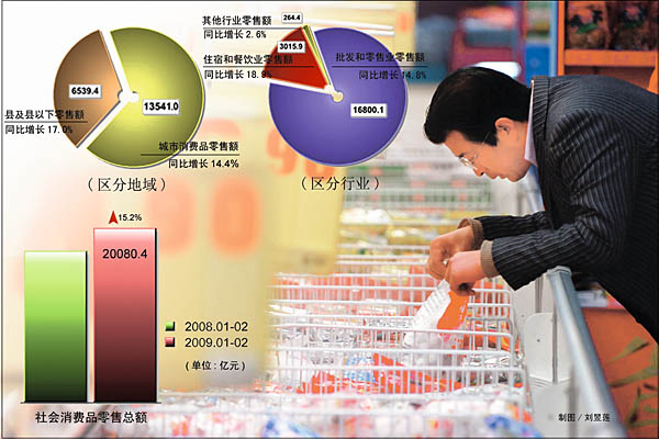 國(guó)家統(tǒng)計(jì)局12日公布,今年1至2月,社會(huì)消費(fèi)品零售總額20080.4億元,同比增長(zhǎng)15.2%。增長(zhǎng)幅度較去年同期下降5個(gè)百分點(diǎn),較去年全年下降6.4個(gè)百分點(diǎn),經(jīng)過(guò)自2007年12月起13個(gè)月超過(guò)20%的高增長(zhǎng)后,首次回落至20%以下。 具體指標(biāo)也可謂是全線下跌:城市消費(fèi)品零售額13541.0億元,同比增長(zhǎng)14.4%,增幅分別較去年同期下降6.4個(gè)百分點(diǎn),較去年全年下降7.7個(gè)百分點(diǎn);縣及縣以下零售額6539.4億元,增長(zhǎng)17%,增幅分別下降1.9個(gè)百分點(diǎn)和3.7個(gè)百分點(diǎn);批發(fā)和零售業(yè)零售額16800.1億元,同比增長(zhǎng)14.8%,增幅下降5.2個(gè)百分點(diǎn)和6.7個(gè)百分點(diǎn);住宿和餐飲業(yè)零售額3015.9億元,增長(zhǎng)18.9%,增幅下降4.2個(gè)百分點(diǎn)和5.8個(gè)百分點(diǎn)。 不過(guò)從結(jié)構(gòu)上看,縣及縣以下消費(fèi)品零售額同比增長(zhǎng)幅度快于城市,是近一年多來(lái)的首次。 分商品類別看,限額以上批發(fā)和零售業(yè)吃、穿、用商品類零售額同比分別增長(zhǎng)14.2%、15.9%和7.6%。其中,糧油類增長(zhǎng)16.3%,肉禽蛋類增長(zhǎng)12.0%,服裝類增長(zhǎng)17.4%,文化辦公用品類增長(zhǎng)8.3%,體育、娛樂(lè)用品類增長(zhǎng)13.5%,日用品類增長(zhǎng)12.0%,家用電器和音像器材類增長(zhǎng)2.7%,家具類增長(zhǎng)27.1%,化妝品類增長(zhǎng)14.6%,金銀珠寶類增長(zhǎng)16.3%,汽車類增長(zhǎng)9.3%,石油及制品類增長(zhǎng)0.7%,建筑及裝潢材料類增長(zhǎng)22.4%,通訊器材類下降9.2%。