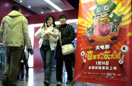 國(guó)產(chǎn)動(dòng)畫(huà)片逆風(fēng)飛揚(yáng),“喜羊羊”票房突破八千萬(wàn)。在北京首都電影院,觀(guān)眾走過(guò)《喜羊羊與灰太狼之牛氣沖天》電影海報(bào)展板。