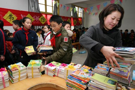 援建農(nóng)民工子弟學(xué)校圖書(shū)室。3月5日,浙江省舟山市南海實(shí)驗(yàn)學(xué)校的同學(xué)將圖書(shū)送到定海區(qū)長(zhǎng)峙陽(yáng)光學(xué)校。