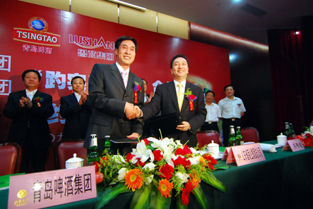 2009年6月6日下午,山東濟(jì)南,青島啤酒股份有限公司與魯商集團(tuán)簽署協(xié)議,達(dá)成青啤并購(gòu)濟(jì)南趵突泉啤酒協(xié)議,兩個(gè)啤酒品牌長(zhǎng)達(dá)12年的鏖戰(zhàn)就此結(jié)束。 供圖:CFP