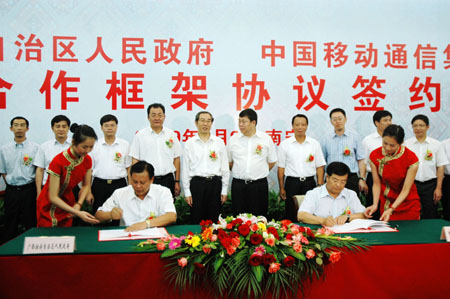 6月9日,中國移動和廣西壯族自治區(qū)代表在南寧舉行簽約儀式。當日,中國移動通信集團公司與廣西壯族自治區(qū)人民政府簽署戰(zhàn)略合作框架協(xié)議,中國移動未來3年將在廣西投資200億元,實現(xiàn)廣西所有市縣城區(qū)TD網(wǎng)絡全覆蓋,推動廣西快速進入3G時代。