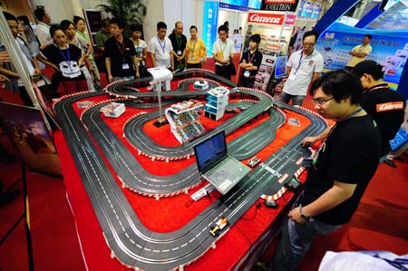 客商在參觀一家玩具制造商展出的路軌數(shù)碼賽車玩具(6月19日攝)。 6月20日,首屆廣東外商投資企業(yè)產(chǎn)品(內(nèi)銷)博覽會在東莞厚街落下帷幕,共達成商貿(mào)項目(含合同、協(xié)議和意向)4879個,總金額509億元人民幣。據(jù)不完全統(tǒng)計,展會3天入場參展、觀展、采購總?cè)藬?shù)超過10萬。