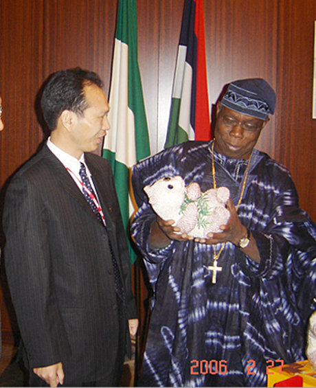 越美集團總裁徐志明向尼日利亞總統(tǒng)贈送禮品。 |