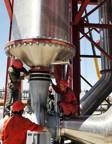 由寧夏石嘴山市引進(jìn)資金3.88億元建設(shè)的6000噸番茄加工項(xiàng)目進(jìn)展順利。目前,這一項(xiàng)目已完成投資0.58億元。項(xiàng)目完成后可日處理番茄6000噸,將有力促進(jìn)農(nóng)業(yè)產(chǎn)業(yè)化發(fā)展,拉動農(nóng)民增收。圖為技術(shù)人員在安裝設(shè)備。