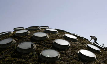 2008年9月18日,在美國加利福尼亞州的舊金山市,一名工人爬上科學(xué)研究院的“活屋頂”。所謂“活屋頂”便是在現(xiàn)代建筑的頂部種草以增加綠植覆蓋,減少溫室氣體。 |