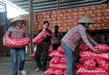10月11日,在廣西憑祥市浦寨邊貿(mào)點(diǎn),從事邊貿(mào)生意的越南水果批發(fā)商在搬運(yùn)產(chǎn)自中國(guó)河北的水果。新華社記者