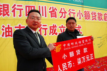2008年1月31日,中國郵政儲蓄銀行江油市支行工作人員(左)給市民任輝發(fā)放7萬元的小額貸款。當(dāng)日,中國郵政儲蓄銀行四川省分行正式啟動小額貸款業(yè)務(wù)試點(diǎn)。這是繼郵政儲蓄存單質(zhì)押貸款之后,中國郵政儲蓄為廣大小企業(yè)主和農(nóng)戶開辟的一個新的貸款渠道,2008年在四川全省推廣。新華社記者  葉建平  攝