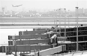上海世界上最大的綜合交通樞紐顯露雛形。圖為虹橋機(jī)場西航站樓登機(jī)引橋和相關(guān)配套設(shè)備已基本安裝完畢。新華社記者