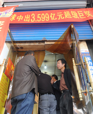 開出3.6億巨獎的河南安陽這家彩票投注站在門頭上懸掛出宣傳條幅。這家投注站因為沾了巨額大獎的喜氣,生意紅紅火火,營業(yè)額成倍攀升,不少外省市的彩民專程跑到這里購買彩票,期望能夠碰上好運氣。