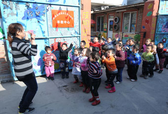 19日,天津社區(qū)早教中心的老師帶領(lǐng)外來流動(dòng)人口子女進(jìn)行戶外活動(dòng)。新華社記者 劉海峰