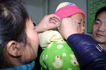 一名聾兒正在陜西省聾兒康復(fù)中心免費(fèi)配戴助聽器。新華社記者 段博