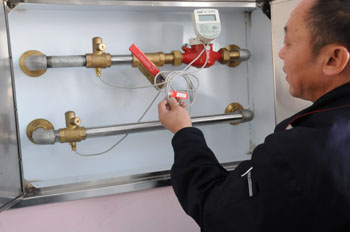 沈陽(yáng)航發(fā)熱計(jì)量技術(shù)有限公司技術(shù)人員正在演示入戶熱計(jì)量表的使用方法。
