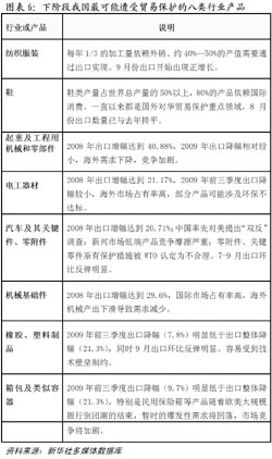 對(duì)出口地執(zhí)政黨穩(wěn)固政權(quán)形成重要支持的行業(yè)。以美國為例,由于工會(huì)在民主黨執(zhí)政基礎(chǔ)中具有重要作用,且2010年美國面臨中期選舉,美國對(duì)華貿(mào)易摩擦進(jìn)一步加劇難以避免。而美國針對(duì)中國產(chǎn)品的貿(mào)易保護(hù)政策示范作用非常明顯,尤其是歐洲市場往往帶頭效仿。