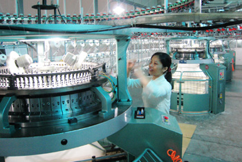 浙江舒美特紡織有限公司地處紡織產(chǎn)業(yè)發(fā)達的紹興市,在金融危機中勇于投入,斥資1000多萬元引進新式針織大圓機機投入生產(chǎn),在保持原有生產(chǎn)模式的同時積極實現(xiàn)了企業(yè)產(chǎn)品的更新?lián)Q代。圖為紹興舒美特紡織有限公司一位紡織女工人在針織大圓機前認真工作。