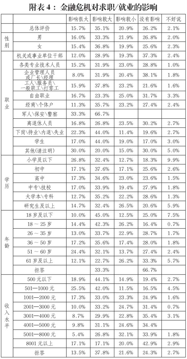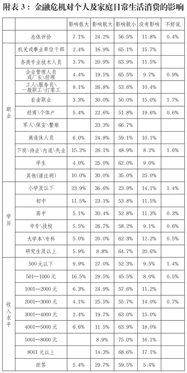 2、城市民眾認(rèn)為金融危機(jī)是暫時(shí)的,“危中有機(jī)”,應(yīng)當(dāng)在危機(jī)中爭(zhēng)取更大發(fā)展。 “每次危機(jī)會(huì)帶來很多機(jī)遇,給個(gè)人也帶來很大的機(jī)遇。覺得中國以后會(huì)很強(qiáng)大! “在這場(chǎng)金融危機(jī)中,我們中國的機(jī)遇大于困難,經(jīng)濟(jì)的蕭條只是暫時(shí),將來會(huì)對(duì)我們中國的經(jīng)濟(jì)帶來相應(yīng)好處! 3、城市民眾普遍感覺金融危機(jī)對(duì)個(gè)人和家庭生活影響不大,但是物價(jià)上漲,房價(jià)飆升還是對(duì)生活造成了一定的影響,就業(yè)困難也是現(xiàn)實(shí)存在的。 “國家領(lǐng)導(dǎo)人對(duì)金融危機(jī)措施非常有力。保護(hù)國內(nèi)市場(chǎng),百姓生活消費(fèi)總體影響不大! “下崗職工、離退休人員收入減少,而物價(jià)上漲比較大! “現(xiàn)在消費(fèi)高了,工資也只是提高了一部分,企業(yè)單位的工資比較低,最主要是現(xiàn)在房價(jià)漲得太迅速。” “國內(nèi)中小企業(yè)遇到了較大的困難,求職也變難了! 4、民眾比較認(rèn)可政府應(yīng)對(duì)金融危機(jī)的措施,但是在措施制定和執(zhí)行方面也有一些意見和建議。 “感覺政府還是比較信賴的,在應(yīng)對(duì)金融危機(jī)的時(shí)候比較理智,采取的措施還是有效果的,對(duì)于家電下鄉(xiāng),汽車下鄉(xiāng),基礎(chǔ)建設(shè)投資都還不錯(cuò)。” “還有好多的政策沒有落實(shí)到實(shí)處,例如:農(nóng)村醫(yī)療合作;農(nóng)村新貸款等。” 還有民眾指出,國家的有些政策和措施是好的,但是地方執(zhí)行上存在一些問題,部分地方官員嚴(yán)重影響了黨的威信和形象。