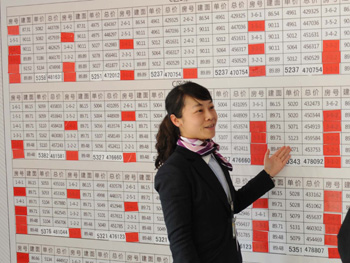 2009年貴陽(yáng)市房地產(chǎn)開(kāi)發(fā)累計(jì)完成近190億元,同比增長(zhǎng)27.1%。2009年12月30日,貴陽(yáng)一家房地產(chǎn)公司五天前推出的房子已售出1/3,售樓工作人員正在向看房者介紹情況(灰色表示已售)! ⌒氯A社記者 朱國(guó)賢/攝 |