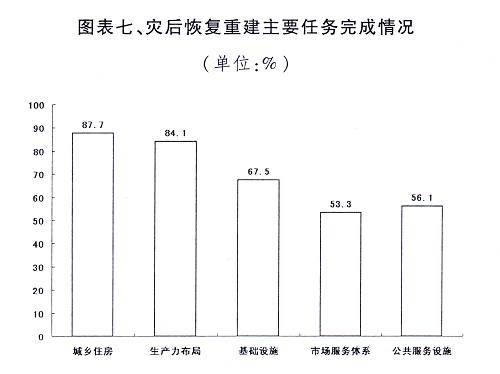 汶川地震災后恢復重建規(guī)劃實施取得重大階段性成果。重災區(qū)累計完成投資6545億元,占規(guī)劃總投資的65.5%,農村住房重建任務基本完成,城鎮(zhèn)住房重建加固全面展開,學校、醫(yī)院和基礎設施建設進展順利,北川、汶川、青川縣城以及映秀、漢旺等重災城鎮(zhèn)建設加快。震區(qū)文化遺產保護得到加強。對口支援工作成效顯著。