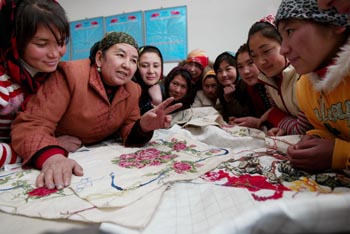 實施西部大開發(fā)戰(zhàn)略10年來,國家在規(guī)劃指導、政策扶持、資金投入、項目安排、人才交流等方面不斷加大對西部地區(qū)的支持力度,有力地促進了西部地區(qū)經(jīng)濟社會又好又快發(fā)展。新疆少數(shù)民族專業(yè)技術(shù)人才隊伍迅速成長。新疆于田縣先拜巴扎鎮(zhèn)初級中學聘請的民間技師忙來西汗(左二)在給該校職業(yè)班的學生上課。新華社發(fā) |