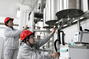 吉林石化研究院的科研人員在開展二氧化碳天然氣的耦合試驗。 該院在天然氣—二氧化碳重整制合成氣技術(shù)方面取得突破,可使煤炭為主體能源結(jié)構(gòu)的二氧化碳回收實現(xiàn)“有利可圖”。 記者日前從吉林石化獲悉,該公司現(xiàn)已提前一年完成“十一五”節(jié)能減排目標,在創(chuàng)造了環(huán)境效益的同時,還創(chuàng)造直接經(jīng)濟效益5.13億元! 。ㄙY料照片)