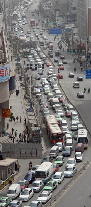 鄭州目前幾乎每條主干道,不分時間段,都是車水馬龍的擁擠場面。鄭州市民更是深受其“害”。有統(tǒng)計數(shù)字表明,鄭州市目前機動車超過137萬輛,平均每天有近800輛新車入戶。公交車輛高峰時平均時速只有14.7公里,基本上比騎自行車快一點。新華社記者 王頌/攝 |