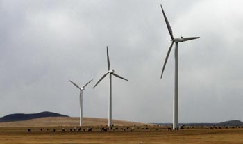 內(nèi)蒙古赤峰市克什克騰草原上的大型風(fēng)力發(fā)電廠。本報(bào)記者 李欣/攝 |