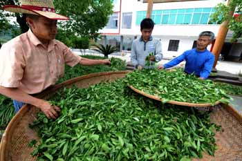 武夷山茶農(nóng)按傳統(tǒng)制作技藝對(duì)茶青進(jìn)行手工搖青。 記者 張國俊/攝