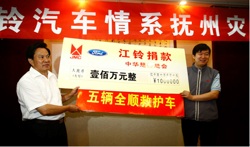 在江西等地發(fā)生的嚴(yán)重洪澇災(zāi)害,造成了巨大的人員財產(chǎn)損失,牽動著國人的心。江鈴汽車股份有限公司全體員工心系災(zāi)區(qū)人民,在第一時間作出反應(yīng),得到福特汽車公司和江鈴集團(tuán)的支持,迅速組織賑災(zāi)捐贈,在公司董事長王錫高指示下,公司緊急捐贈5輛災(zāi)區(qū)急需的福特全順救護(hù)車并捐款100萬元人民幣,總計200萬元的款物給受災(zāi)最嚴(yán)重的撫州洪澇災(zāi)區(qū)。