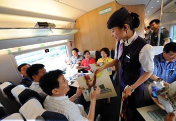 7月1日,滬寧城際線G5001次列車的列車員在向旅客贈送滬寧高速鐵路開通運(yùn)營紀(jì)念郵品。本報(bào)記者 孫參/攝 |