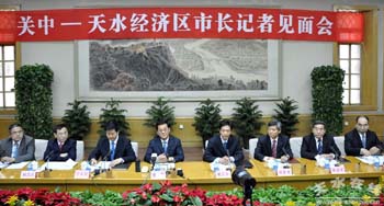 | 2010年4月9日,關(guān)中—天水經(jīng)濟(jì)區(qū)“七市一區(qū)”市長在西安與中外媒體記者見面,通報《關(guān)中—天水經(jīng)濟(jì)區(qū)發(fā)展規(guī)劃》實施情況。資料照片 |