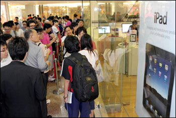 7月23日,蘋果iPad登陸香港市場,市民、游客在銅鑼灣時(shí)代廣場蘋果專賣店門前排起長隊(duì)。新華社記者 宋振平/攝 |