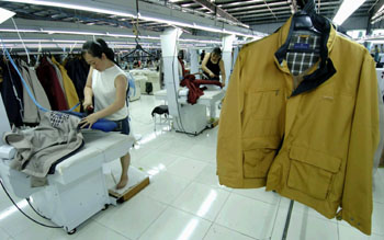 近年來,大批制衣、紡織等外資企業(yè)進(jìn)入吉林省延邊朝鮮族自治州琿春市紡織工業(yè)園區(qū),制作的服裝遠(yuǎn)銷韓國、日本、東南亞等地。2006年,該園區(qū)年產(chǎn)成衣3000多萬件、紗產(chǎn)量達(dá)5000多萬噸,產(chǎn)值達(dá)4億多元。圖為幾名熨燙工人在琿春紡織工業(yè)園某制衣車間熨燙服裝。新華社記者 遲海峰/攝