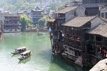 圖為游客在湘西鳳凰沱江上泛舟欣賞沿岸的特色民居。新華社記者 龍弘濤/攝