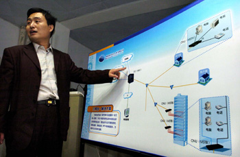 在建設(shè)部授予“全國數(shù)字社區(qū)示范工程”稱號的江蘇鎮(zhèn)江恒美嘉園光纖到戶項目現(xiàn)場,工作人員在介紹光纖到戶、三網(wǎng)融合示意圖。2005年,該光纖駐地網(wǎng)就全面開通,覆蓋用戶1000多家。資料照片 |