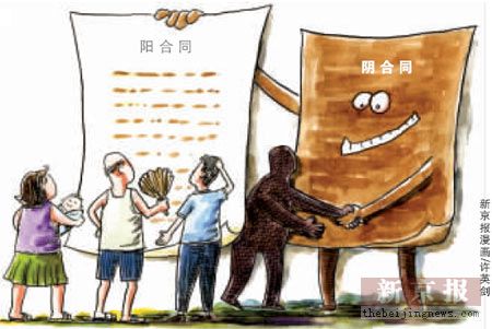 北京昌平舊村改造時(shí)承諾的村民新居沒見影兒,土地上卻建成了豪華別墅。在維權(quán)過程中,村民們追查出村委會(huì)、開發(fā)商簽訂的“陰陽(yáng)合同”:公開給村民的“陽(yáng)合同”中規(guī)定,舊縣村提供給開發(fā)商1820畝土地,收征地補(bǔ)償款6000萬(wàn);而交給政府有關(guān)部門備案的“陰合同”規(guī)定,開發(fā)商征用舊縣村土地689.41畝,補(bǔ)償金是1億余元。(《京華時(shí)報(bào)》8月26日) |
