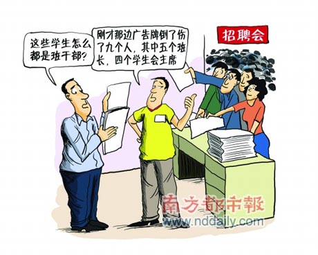 在4月9日出版的《瞭望東方周刊》上,上海作者陳可慰寫了一篇短文,談及今年大四的表弟所在學校最近召開一次畢業(yè)生大會,除分析目前的就業(yè)形勢及對策外,校方還宣布了幾項為方便學生就業(yè)而創(chuàng)造的有利條件。其中一條是:“提高優(yōu)秀畢業(yè)生、三好學生的評選比例,增加學生會干部及班干部的名額,力爭讓每個學生都有一個'官’,以便寫進簡歷,增加就業(yè)競爭力!