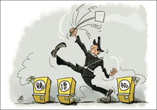 新聞:漢口中山大道五福路附近的“銀泰游戲室”暗藏17臺賭博機,記者4次報警,四唯街派出所兩名處警民警,在現(xiàn)場只是驅趕賭徒,并未查處店家和賭博機。4天后,記者發(fā)現(xiàn)游戲室又新增了8臺賭博機,共有11人參賭。這家游戲機室,前門距四唯街派出所不足80米,后門距五福警務室僅15米,居然存在了兩年。(1月25日《武漢晨報》)