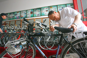 被譽(yù)為“自行車(chē)收藏大王”的72歲老人王明璽,帶著他的140余輛稀奇古舊的自行車(chē),近日正式落戶北京豐臺(tái)區(qū)南苑村中國(guó)民俗旅游文化街內(nèi),這位古稀老人將在這里打造一個(gè)“自行車(chē)博物館”,以供市民免費(fèi)參觀。 在南苑村的“自行車(chē)博物館”內(nèi),140余輛各種各樣的自行車(chē),有紅色、黑色、黃色和綠色等各種顏色的,有的是鏈條傳動(dòng),有的是皮帶傳動(dòng),還有一些是現(xiàn)在已經(jīng)罕見(jiàn)的軸承傳動(dòng);有的車(chē)還在前后分別裝有照明燈、轉(zhuǎn)向燈,有的還有里程表、變速盒和坡度指示器。 “這些車(chē)大多是英國(guó)和日本產(chǎn)的,還有一小部分是荷蘭、泰國(guó)和馬來(lái)西亞生產(chǎn)的!卑【傻耐趺鳝t老人說(shuō),這些自行車(chē)寶貝都是他一輩子的心血,為了收藏這些寶貝,他幾乎傾注了所有的積蓄和業(yè)余時(shí)間。他時(shí)不時(shí)地要轉(zhuǎn)一轉(zhuǎn)北京和外地的舊貨市場(chǎng),最常去的是上海、天津、長(zhǎng)春等地。他弄到手的車(chē)通常都有七至八成新,但也有一些剛買(mǎi)回來(lái)的時(shí)候比較破舊,需要自己修理。 王明璽老人向參觀者展示他自己設(shè)計(jì)的一輛“健身車(chē)”,這輛高約一米、長(zhǎng)兩米的自行車(chē),不僅帶車(chē)燈,而且還帶有里程表。這輛自行車(chē)最特殊的地方在于后輪通過(guò)軸心的變換,騎車(chē)人騎上后一會(huì)高、一會(huì)低,仿佛爬坡一樣,非常適合鍛煉身體。老人開(kāi)玩笑說(shuō):“這輛‘健身車(chē)’是我自己設(shè)計(jì)的,一般胖人騎上一個(gè)月,肚子就會(huì)減小很多! “建一個(gè)民間的‘自行車(chē)博物館’,讓大家都能了解自行車(chē)發(fā)展的歷史,喜愛(ài)自行車(chē),是我這輩子最大的心愿。”王明璽老人動(dòng)情地說(shuō)。