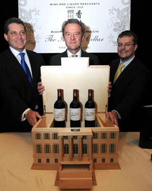 5月26日,嘉賓和即將在香港拍賣的3瓶瑪歌堡頂級(jí)佳釀連精美Linley酒柜合影(起拍價(jià)為港幣40萬元)。當(dāng)日,Acker Merrall &
