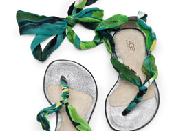 將奢華舒適完美演繹的美國(guó)休閑鞋品牌UGG Australia日前推出了全新春夏系列Shangri-La Col-lection(香格里拉系列)。該系列在綁帶涼鞋和羅馬鞋中融入了UGG的細(xì)致和舒適。以多種柔軟皮革、小山羊皮、絲綢為材料加以金屬的飾品搭配,讓整個(gè)系列充滿了時(shí)尚風(fēng)情,又不失品牌細(xì)膩的體貼。其中,Khole以時(shí)尚印花圖案的絲帶纏繞整個(gè)腳面和腳腕,讓雙腿更加美麗。