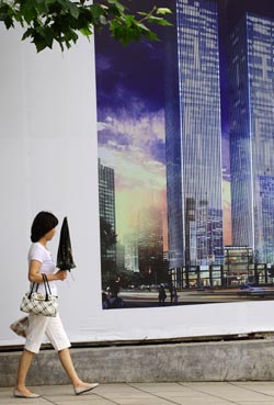 7月11日,一位女士從市中心的一處樓盤促銷廣告牌前經(jīng)過!∵M入6月,大連樓市多個樓盤出現(xiàn)“個位數(shù)成交”,部分地產(chǎn)項目陸續(xù)推出了全款打折優(yōu)惠。新華社記者