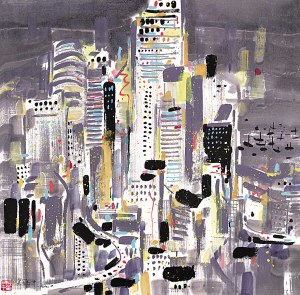 吳冠中借喻了魯迅筆下的“小樓”,表述的是自己躲進藝術殿堂,走南闖北,東尋西找,上下求索的境懷;以及越過傳統(tǒng)筆墨、傳統(tǒng)圖式,不為外界左右的藝術激情!包c、線、面,黑、白、灰,加自家色彩”是吳冠中藝術形式的七要素。在這幅畫中,作者將這些要素充分展示給了觀眾。另一幅作品《香港夜景》是吳冠中受香港土地發(fā)展公司邀請,專程在香港停留一個月而創(chuàng)作出的嘗試性作品之一。畫面無處不涌動著作者的創(chuàng)作激情,其大膽的跳過線的點與面的結合,加上豐富色彩的綜合運用,將香港之夜表現(xiàn)得熱鬧而又神秘。吳冠中曾多次撰文提到這次香港創(chuàng)作之旅:“我確乎愛那些古老市街的風采,那是我青少年時代所熟悉的祖國鬧市,我曾在其間逛游,當時只是觀光,無錢購物,今日坐在香港街頭寫生,筆底卻流露出童年的憧憬來!
