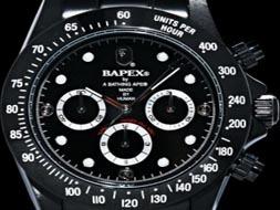 黑色對于很多人來說充滿了深藏不露的神秘感,特別是全黑魂版的手表,一向是潮人的入貨指標,就連藤原浩都找英國的Bamford Watch Department用PVD技術(shù)去特制了些fragmentdesign閃電版“黑撈”。而BAPE亦乘勢推出了最新的全黑魂版的Bapex,3針表上除了數(shù)字、刻紋外,無論表身、表帶、表盤全用上黑色作主要色調(diào),cool!