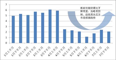 新政后二手房市場供需比迅速回落,至7月上半月,供需比已達到1:2.4左右,至7月25日即新政100天之際,供需比已降至1:2.1左右,與新政前3月下半月供需比最高峰時的1:6.1比較而言,可以說需求的回落速度相當驚人,幾乎比房源快了3倍。