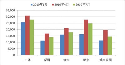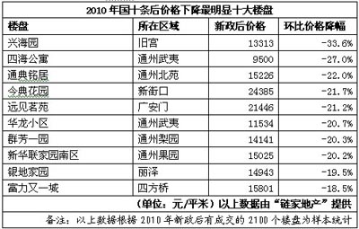 新政后全北京市120個商圈價格幾乎全面下跌,與4月初相比,降幅超過10%的商圈達70個,比重達58%;其中43個商圈價格回歸到2010年初。典型商圈二手房價均經(jīng)歷了價格沖高后回落的過程。