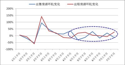 新政前出售房源與出租房源的環(huán)比變化基本都具備一定的季節(jié)性,即春節(jié)后出現(xiàn)高峰期,此后增速逐漸回落;而新政后初期,出售房源增長迅速,此后迅速回落,反之租賃房源開始明顯上漲,也就是說租賃房源上漲或下跌,比出售房源恰好滯后了一個周期。也就是說,此前二手房與租賃市場供應(yīng)各自發(fā)展的軌跡,再新政后開始有了“微妙”的聯(lián)系,業(yè)主從競相出售到轉(zhuǎn)售為租,開始對租賃市場有所影響。