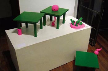 space”,途中一共問了6個交通協(xié)管員。這是一幢帶花園的小洋樓,仔細(xì)尋找一番后,終于在門口看到了關(guān)于這個展覽的小小招貼—巴掌大的招貼用纖細(xì)的文字告訴你:就在這里。這讓我想起星爺版《鹿鼎記》中韋小寶在菜市場尋找天地會分舵的一幕。展廳大概10平方米,里面擠滿了“藝術(shù)發(fā)燒友”。當(dāng)時我就在想,做這樣的展覽真好,只要來五六個人,就感覺濟(jì)濟(jì)一堂了。 楊腸筱道,這個名字來自這次展覽的兩位女藝術(shù)家,胡筱瀟和陸楊?吹剿齻儠r,胡筱瀟正在給每位來賓分發(fā)她的藝術(shù)材料,一種顏色奇艷、介于雕塑泥和軟糖之間的泡沫,她就是用這種古怪材料加上幾只仿真蒼蠅、幼兒園的木質(zhì)小板凳,糾纏在一起做出的作品。當(dāng)看到每一位來賓一邊談話,一邊手里都不知不覺把她的泡沫泥捏成稀奇古怪的形狀時,我知道,胡筱瀟又在得意了。我們都已經(jīng)不自覺地成了她作品的一部分。然后她還用非常劣質(zhì)的木框把自己寫的類似童話、詩歌或者小說的文字框起來,一絲不茍地譯成英文。真有不少人在認(rèn)真地試圖讀懂其中的意思。這就是小空間的好處,空間太小人太多,當(dāng)你不認(rèn)識什么人也無話可說的時候,最好就是假裝去思考作品的深刻含義。 陸楊的作品和她的長相一樣,貌似清秀,但這是假象。她喜歡很和藹可親地給你講述一件無比殘酷的事情。她的作品用很清秀的手繪圖片和很干凈細(xì)膩的文字,告訴你很多種新奇的自殺方式。對殘酷的迷戀,或許是80后新人的某種集體愛好吧。