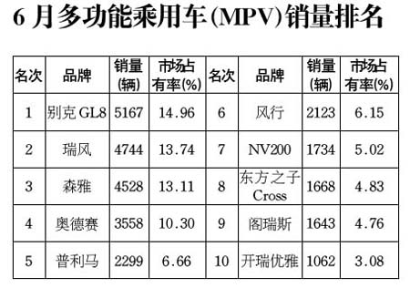 6月多功能乘用車(MPV)銷售34534輛,環(huán)比增長2.45%,同比增長83.57%,并出現(xiàn)了供不應(yīng)求的火爆場面。其原因,隨著國內(nèi)汽車市場的不斷發(fā)展,MPV市場開始迅速成長,奔馳、大眾等一線廠商也將自己的產(chǎn)品引入國內(nèi)市場,國內(nèi)MPV也開始了針對家用、商務(wù)、行政等多元化的市場發(fā)展。 從6月份的銷售情況來看,排在前三名的企業(yè)是:東風(fēng)汽車、上海通用、江淮汽車,單月銷量分別為:5498、5167、4744輛,三家企業(yè)共銷售15409輛,占MPV企業(yè)總銷量的44.62%。 6月銷量排名前10位的MPV品牌依次為:別克GL8、瑞風(fēng)、森雅、奧德賽、普利馬、風(fēng)行、NV200、東方之子Cross、閣瑞斯和開瑞優(yōu)雅。上述10個(gè)品牌共銷售28526輛,占MPV銷售總量的82.6%。 與上月相比,別克GL8、瑞風(fēng)、奧德賽、風(fēng)行、閣瑞斯排名不變,森雅與普利馬的名次互換,NV200闖入十強(qiáng),帥克退出十強(qiáng),東方之子Cross由上月的第七位下降至第八位,開瑞優(yōu)雅由上月的第八位下降至第10位。 GL8和瑞風(fēng)仍是市場的主力,兩者的商務(wù)需求表現(xiàn)較好,別克GL8雖繼續(xù)保持第一,但銷量較上月微降1.19%;森雅表現(xiàn)最突出,較上月增長88.27%,其產(chǎn)能釋放后的銷量拉升迅猛,進(jìn)入新的產(chǎn)銷量區(qū)間;普利馬目前處于高銷量后的回落期,較上月下降27.22%;瑞風(fēng)、奧德賽分別較上月增長43.78%和19.28%。 新品NV200是近期的重點(diǎn)趨勢車型,對競爭極不充分的MPV市場的產(chǎn)品導(dǎo)入有重大的參考意義。