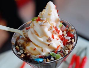 來自美國進(jìn)口的冷凍花崗巖板可非一般,它是帶給你一款完美冰淇淋的重要環(huán)節(jié)——拌冰臺(tái)。零下9℃的冰凍花崗巖石板觸及冰涼,作用于冰淇淋坯和各種配料的混合成形,拌冰工具為同樣冰冰涼的冰鏟。每個(gè)店員都有朝氣蓬勃的團(tuán)隊(duì)氣質(zhì),他們還能每隔一會(huì)兒唱歌給你聽,隔空拋接冰淇淋球的表演絲毫不亞于雜技演員。每個(gè)店員都經(jīng)過專業(yè)培訓(xùn),利用雖執(zhí)拗但已經(jīng)被他們操作麻利的拌制手法,讓原本在冰凍柜臺(tái)中硬硬的冰淇淋回復(fù)蘇醒,隨之加入各種你一見鐘情的配料,一杯綿滑香濃的冰淇淋就這樣誕生了。 拌冰的程序是每個(gè)店員都成為冰淇淋專家的重要步驟。選擇口味:巧克力、香草、芝士蛋糕、草莓、芒果雪貝等各種美妙滋味,尤其推薦芒果口味。選擇杯型:推薦中杯(170克)。選擇配料:醬料、各種巧克力豆、彩虹糖粒兒、各種餅干、水果、果仁。最后考慮下你是否需要2元一個(gè)的華夫底托,這是酷圣石冰淇淋最美妙的視覺和口感中的另一所在。推薦室外座位和樓上座位,三里屯和雅秀間的風(fēng)景一目了然。顧客中老外居多,27元/小杯,39元/中杯,50元/大杯。 地址:朝陽區(qū)工體北路三里屯VILLAGES9-19-20號(hào)