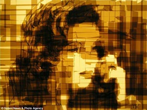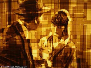 據(jù)《每日郵報》報道,一位烏克蘭藝術家發(fā)明了一種全新的藝術創(chuàng)作形式,他用封箱膠帶作畫,在燈箱上“粘”出經(jīng)典的電影鏡頭。 今年51歲的馬克·凱斯曼出生在烏克蘭,目前在美國費城工作和生活。他巧妙地利用了燈箱作為光源背景,用棕色透明膠帶在上面粘出一幅幅繪畫作品。凱斯曼把他最喜愛的電影鏡頭當作作畫的素材,通過膠帶的重疊層次變化表現(xiàn)色彩明暗和深淺。 令人驚奇的是,這些膠帶畫雖然材料粗糙,卻異常精美,連人物的面孔和表情都惟妙惟肖。